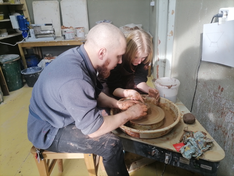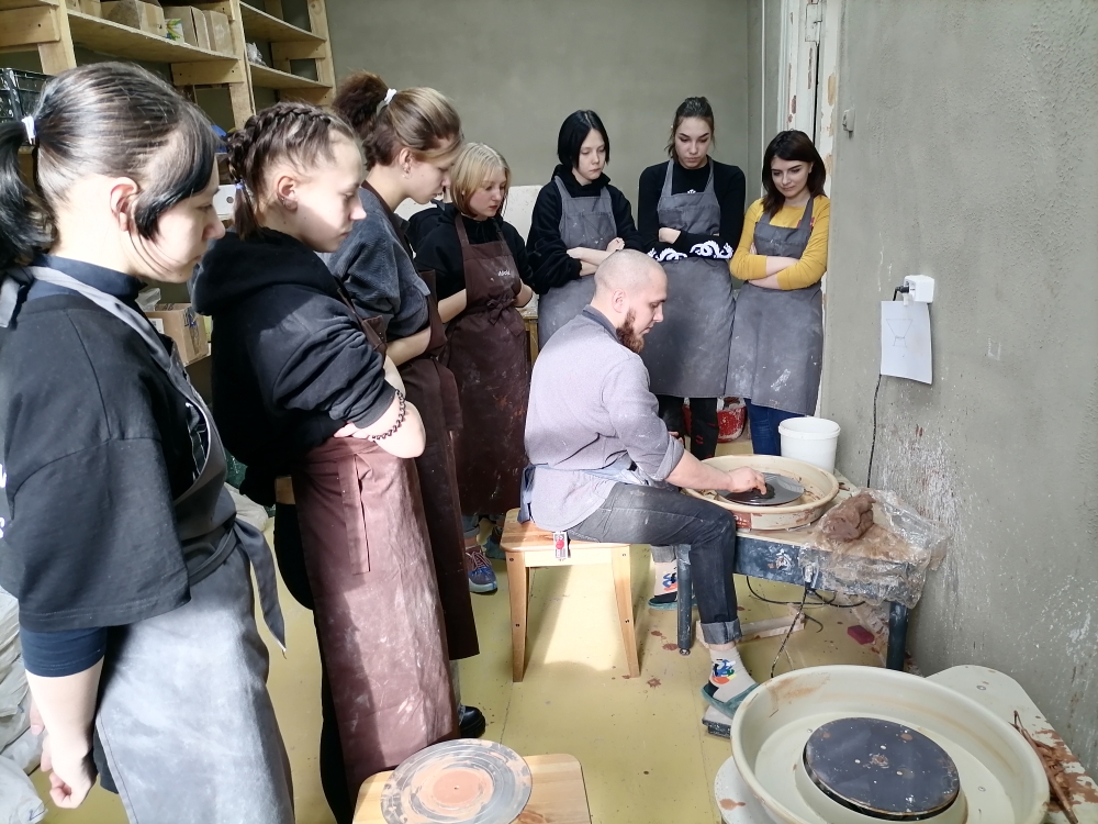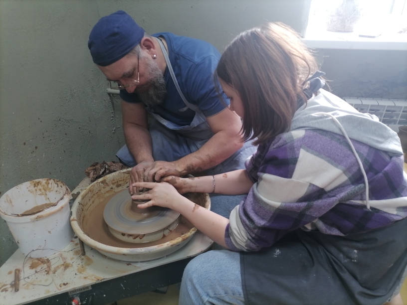 Несмотря на видимую простоту работы на гончарном круге, этот процесс имеет свои тонкости. Очень важный момент при работе за гончарным кругом — это постановка рук. Каждый участник мастер-класса вместе с Ильей и Александром поработали на гончарном круге, создавая первое в своей жизни изделие из глины. Руководители студии помогали советом, а если нужно, подправляли поделку.«Большое отличие наших занятий — результат своего творчества вы забираете с собой»,- отметил Александр.