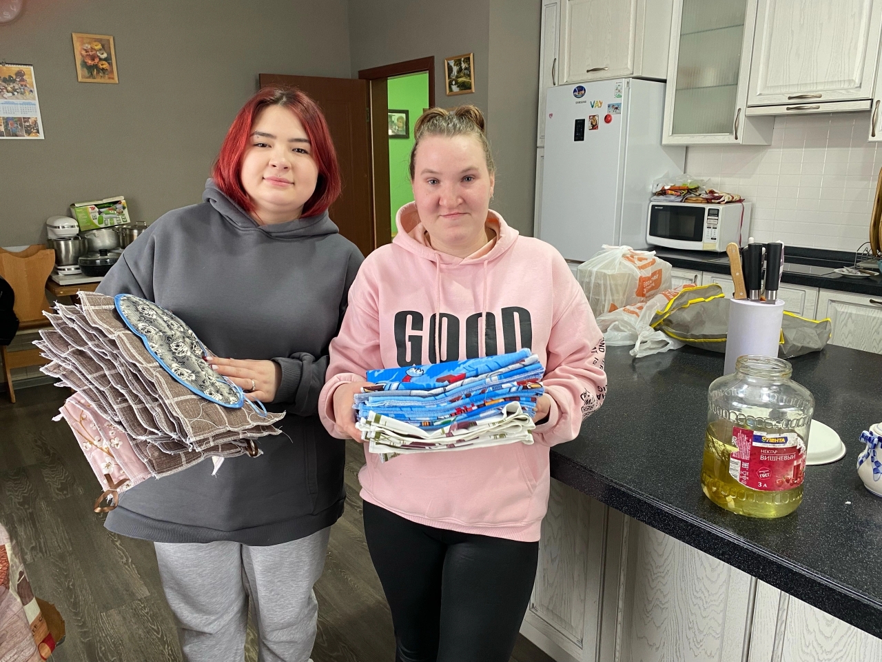 В преддверии праздников 23 февраля и 8 марта девушки подготовили для своих подопечных подарки — наборы полотенец и прихваток. Они вручили их вместе с обедом.