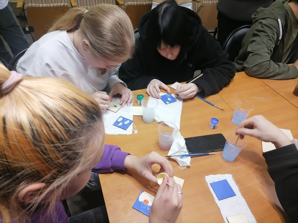 А скоро Новый Год. «Можете загадать три разных желания и изобразить их, используя краски, на выданных мною каждому из вас квадратах» ,- продолжил Александр. Так начался мастер-класс для участников проекта и гостей фонда. Ребята приступили к выполнению задания, стараясь изобразить свою мечту. А она у всех разная. Обстановка во время мастер-класса была творческая, ребята увлеченно выполняли задание, а Александр ненавязчиво продолжал общаться с участниками мастер-класса о жизни, об искусстве.