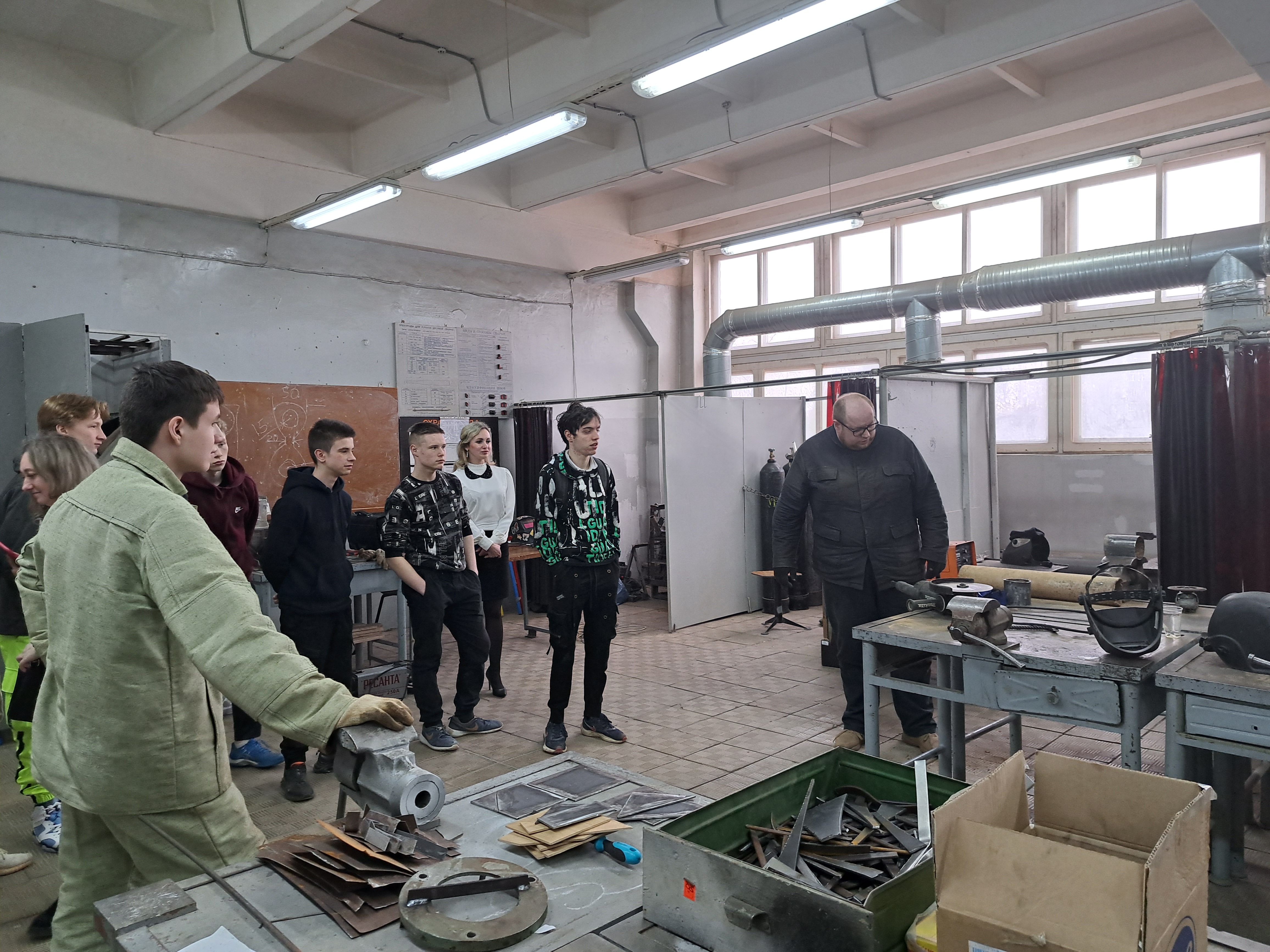 Далее мастер производственного обучения Елена Анатольевна провела для участников экскурсию по цехам: ручной деревообработки, механизированной обработки, сухого строительства, сварочному. В каждом цехе нам подробно рассказали о профессии, показали работу станков и пообщались с мастерами, отвечающими за производственное обучение. Но более подробно остановились в каменной мастерской. Ребят по звуку научили определять качественный кирпич от не совсем качественного.