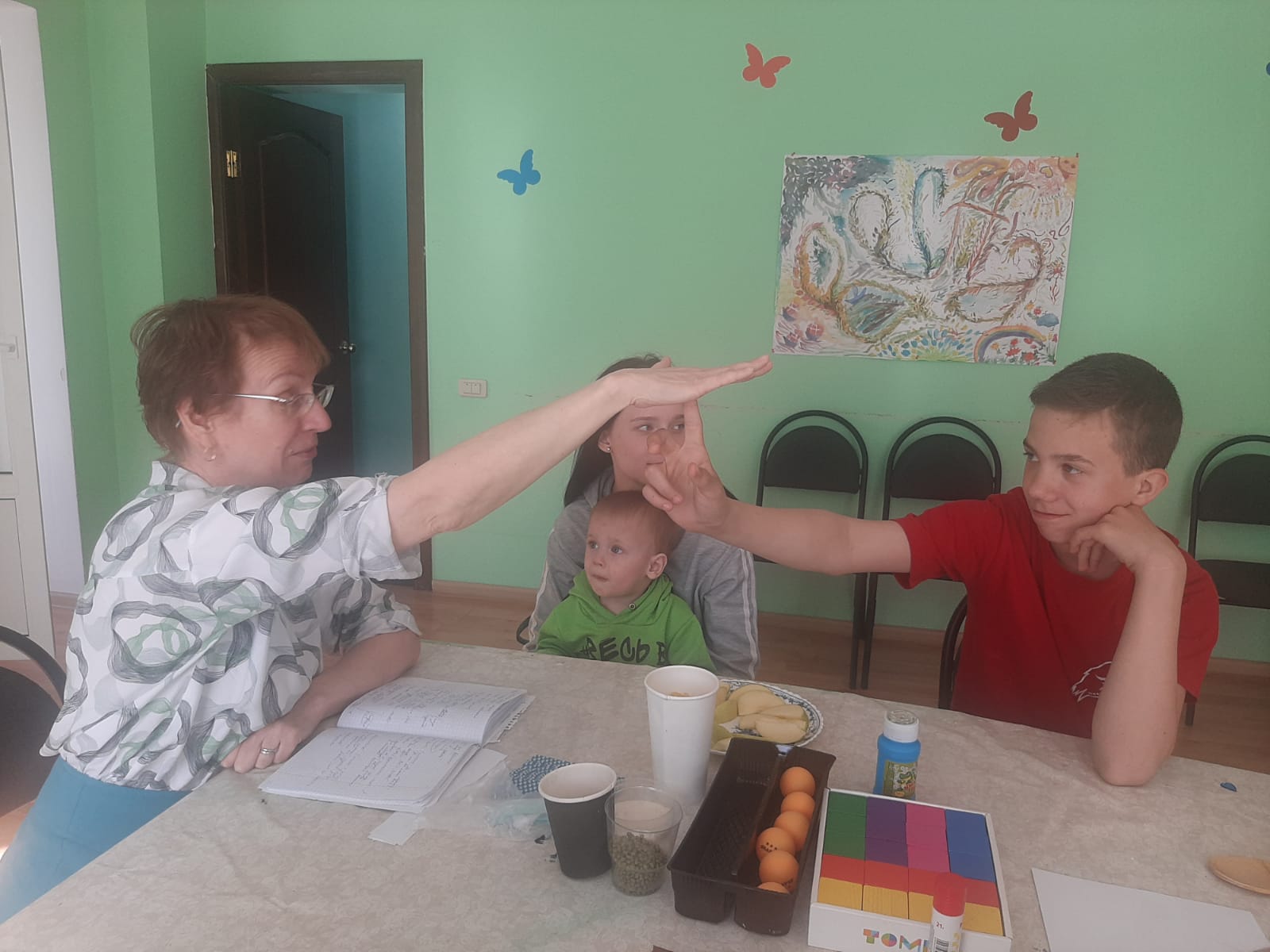 Во время мероприятия мамы и дети не только слушали теорию, но и активно играли вместе. Малыши с удовольствием участвовали в пальчиковых играх и считалочках, а также создавали дорожки из макарон и гречки.
