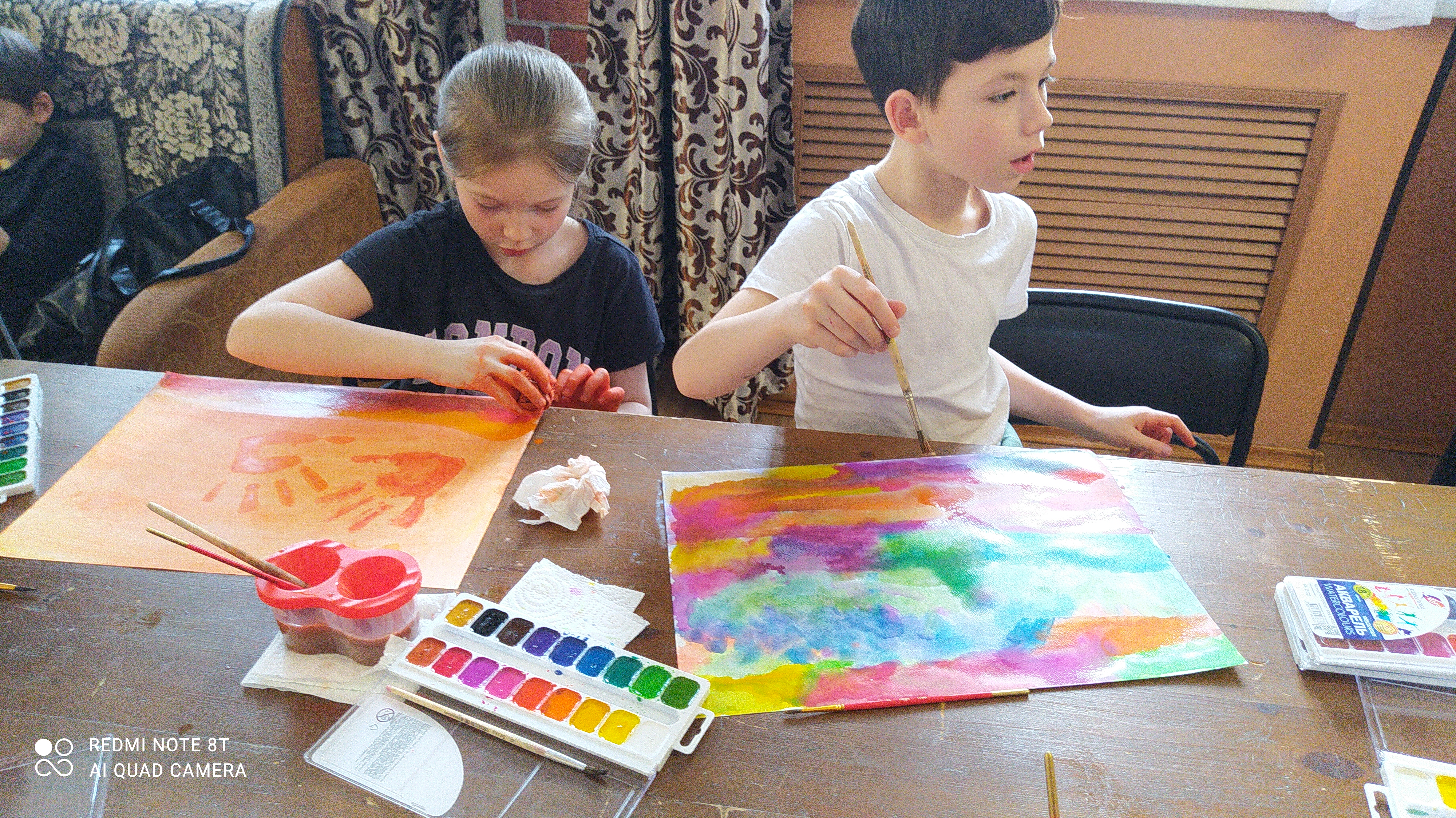 Взрослые же сначала прислушивались к себе, только потом брали кисточки. Настроение у родителей оказалось не менее солнечным и красочным! Желто-красные пятна приближающейся весны, мечты о теплом море, радуга над летним лугом. И даже на черном фоне написана главная мечта белой краской.